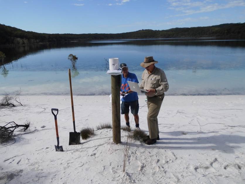Setting up the Lake McKenzie (Boorangoora) rain gauge that had to be located in a clear open area away from people