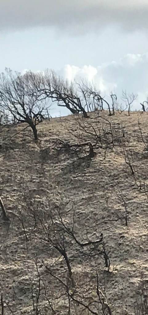 During these eight weeks, the wind blew from every conceivable direction ranging from gale force to perfectly calm. The fires were very variable, and the resultant impact on the landscape was equally variable. At times the fires were extremely hot, totally engulfing the vegetation inflicting lasting damage. In contrast, at other times, it just crept along the surface, burning the accumulated material but not extending into the canopy of trees and shrubs.