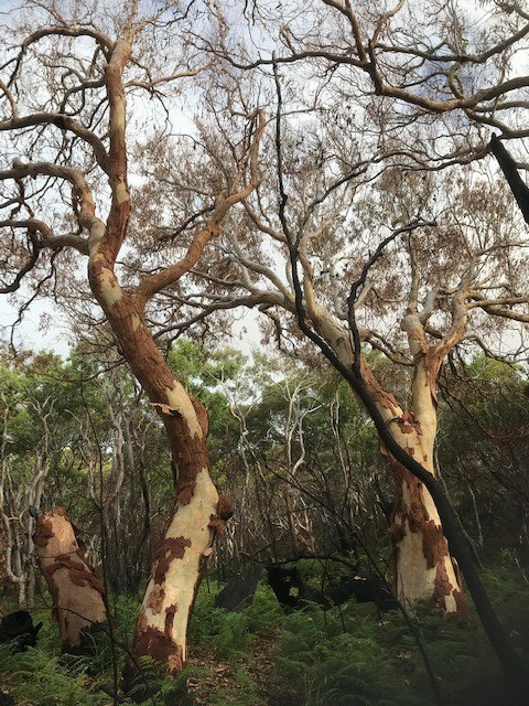 Some of the forests, especially around Happy Valley, experienced very hot burns. Some species, notably Scribbly Gums (Eucalyptus racemose) and Moreton Bay Ash (Corymbia tessellaris) appear to have died over extensive areas. Others like Blue gums (Eucalyptus tereticornus) are reshooting, with Swamp turpentine (Lophostemon suaveolens) has bounced back with great vigour. It is covered in shoots and is flowering on the new growth.
