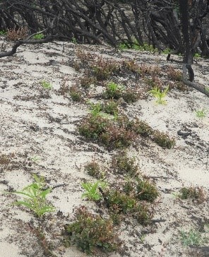 The foredune complex has been significantly impacted in places (Fig. 9), and full recovery is expected to be slow, particularly in the coastal she-oak communities. Nevertheless, a range of species are resprouting strongly from the rootstock, e.g. Austromyrtus dulcis (midjim berry) and/or stems and seedlings of some species are common (e.g. Acacia spp.) (Fig. 10). Recent rains will further assist the recovery process.