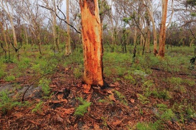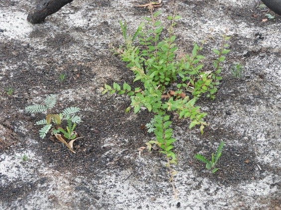 Resprouting is common and widespread in the open to tall open forests and seedlings of canopy species, such as Eucalyptus pilularis (blackbutt), Eucalyptus resinifera (red mahogany) and Lophostemon confertus (brush box), are common in the open ground created by the fire.