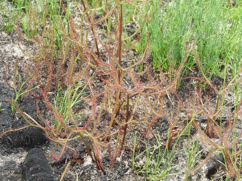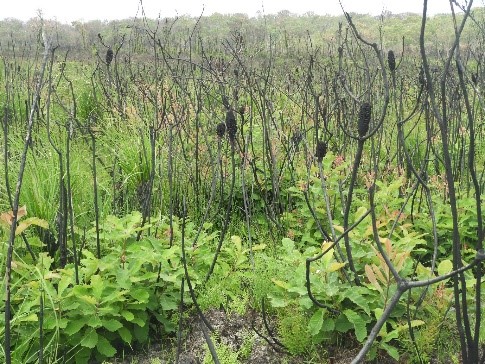 Regeneration in the fens and other peat-based swamps is advanced in most cases with dominant woody species (e.g. Banksia robur (swamp banksia), Leptospermum liversidgei (swamp may) resprouting from the base. Herbaceous species such as sedges, rushes and forbs, e.g. Drosera spp. (sundews) are also resprouting from underground organs such as rhizomes and bulbs (Figs 4 & 5).