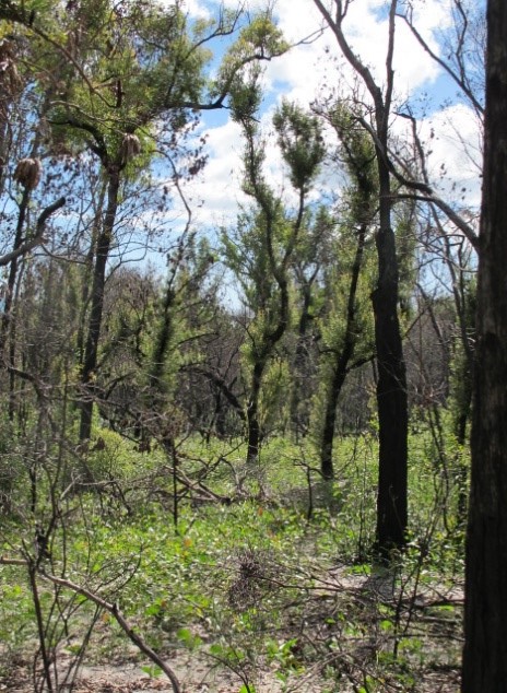 For instance, within a Regional Ecosystem (RE), 12.2.6 is described as Eucalyptus racemosa subsp. racemosa open forest on dunes and sand plains, there was an increase in tree death and reduction in overall BioCondition score with increasing fire intensity. However, observed recovery through widespread vegetative resprouting and some species establishment from seed will most likely result in improved BioCondition scores as the structure is restored. In some burnt areas, recovery was characterised by mass germination of Acacia penninervis var. longiracemosa, A. flavescens and Dodonaea viscosa subsp. burmanniana into dense layers.