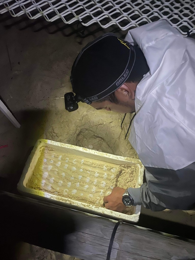 Three loggerhead nests were relocated to the caged areas at the front of the lighthouse. The eggs must be carefully handled so that the developing embryo does not move inside the egg. If this happens, it will kill the hatchling. Eggs were marked with a line facing the water to maintain their orientation until they were replaced in the sand. An egg chamber was dug in the caged area before the eggs were relaid and then re-covered with sand.