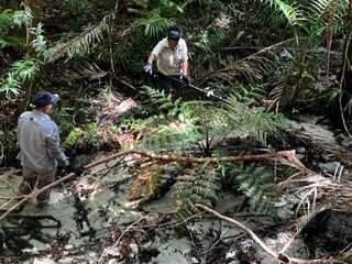 Some vegetation required cutting back with machetes and other heavy-duty cutting tools, and when needed, a small chainsaw was used. While in other areas, vegetation was cleared by hand. The team covered approximately 600 metres of the creek bed and adjacent areas. Some plastic waste was also retrieved from the creek.
