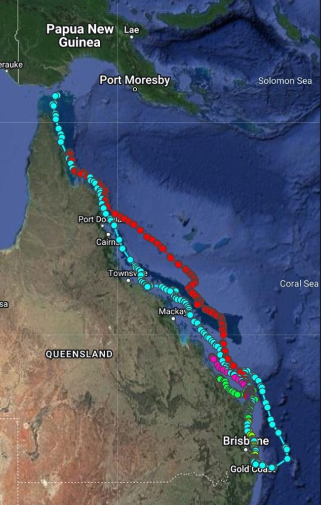 Three of the nesting loggerheads went north and settled on reefs – one off eastern Cape York, the second near Yeppoon in Rodds Bay, south of Gladstone, and the last one is still migrating northwards and is currently north of Port Douglas, after first visiting the Gold Coast. Her track there, via the deep ocean, is visible on the map.