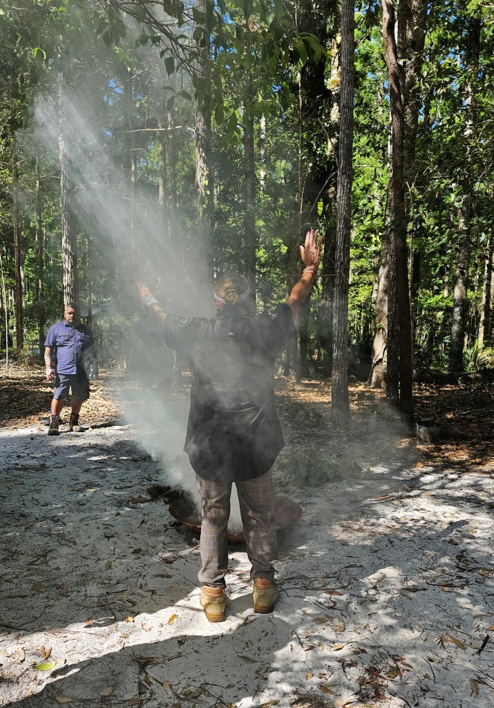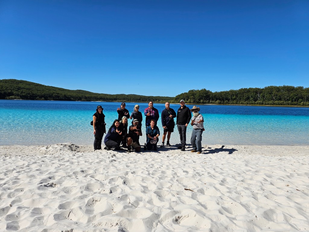 The project has also extended Internationally, with funding allowing for Māori groups working on myrtle rust in New Zealand to visit the Butchulla people on K’gari and Gumbaynggirr people in Coffs Harbour. The trip started on K’gari on the 8th of May with Butchulla (Butchulla rangers and knowledge holders, including Butchulla Elder and community linguist, Aunty Josey (Joyce) Bonner) warmly welcoming our New Zealand visitors. All were welcomed to K’gari with language, song, dance, story and cleansing smoking ceremony.