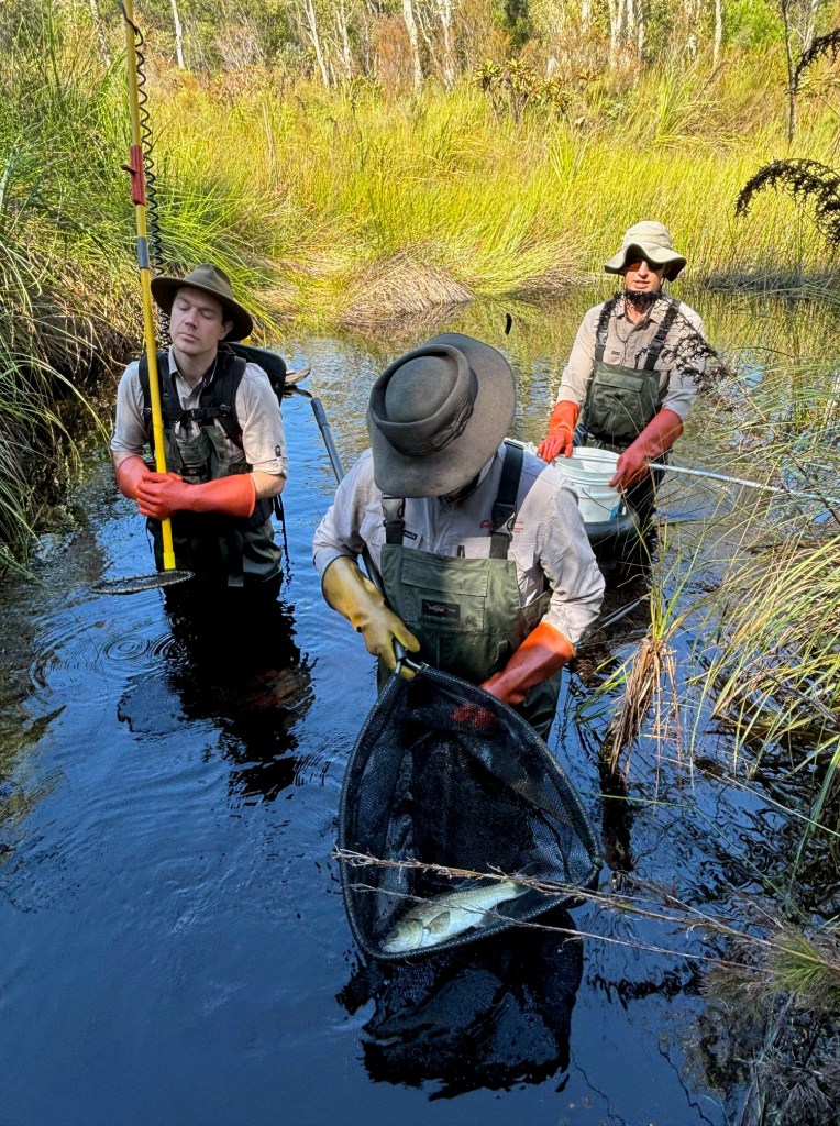 Following a welcome to Country by Butchulla songman, Travis Page (Dinka Dinka) at the Wongari Den at Kingfisher Bay Resort, the large vehicle convoy ‘shipped out.’ The first stop on the itinerary included meeting with members of Griffith University’s Australian Rivers Institute to learn about the post-bushfire monitoring of K’gari and the aquatic health impacts that it had on the island’s creeks and wetlands. Participants were able to observe members of the Griffith University team (Prof. Mark Kennard, Dr Luke Carpenter-Bundhoo and researcher, Josh Whiley) sampling in action as they monitored Rocky Creek – learning about the Endangered Australian brook lamprey (Mordacia praecox) that was recently discovered on K’gari.