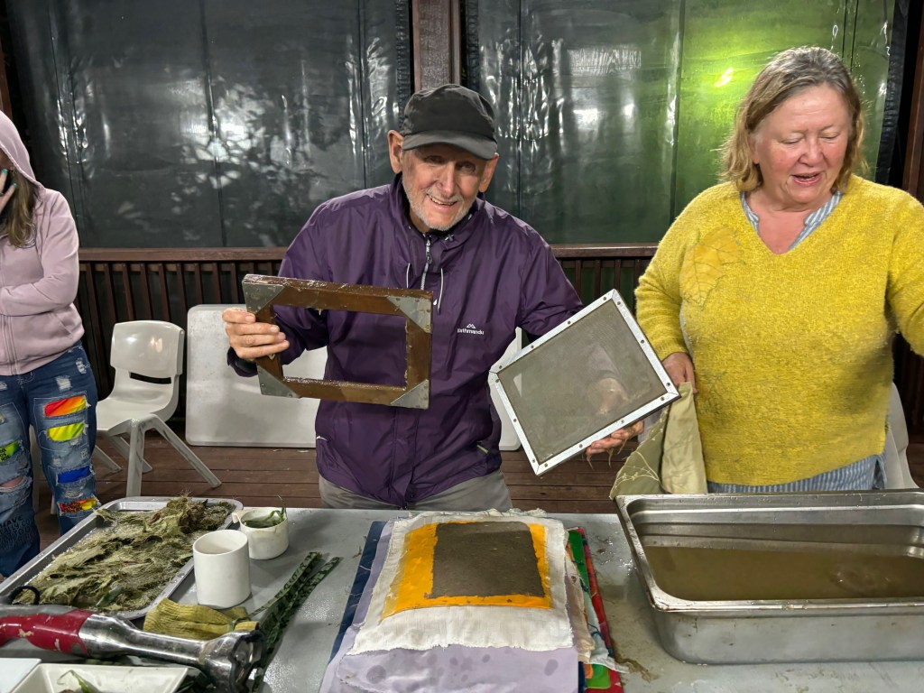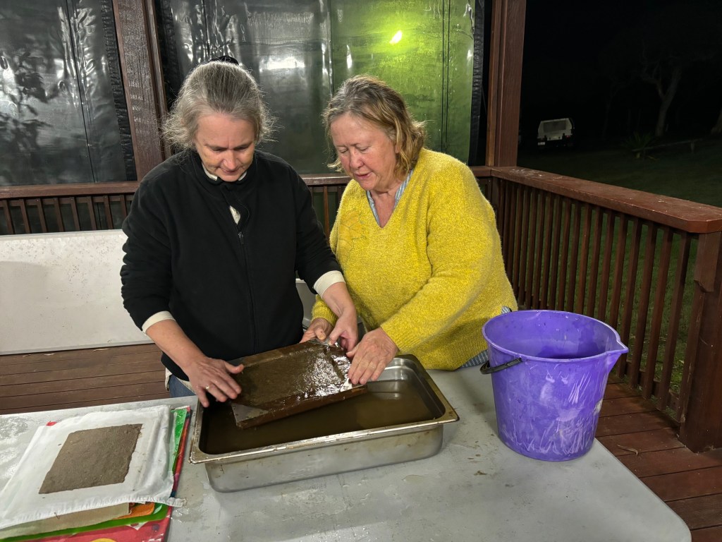 The final stop for the day was Dilli Village, where Dr Kim Walker provided an update on the onsite interpretation upgrade and renaming the Research and Education Centre as the K’gari Research Station. After dinner, members then joined FIDO’s President, Zela Bissett for a Paper to Weeds workshop, learning about the opportunity to turn fibrous weed waste into a valuable resource – art paper.