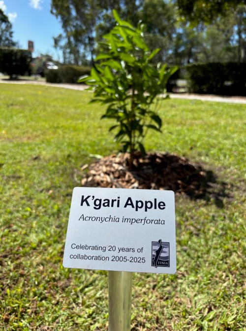 Founded in December 2005, on 25 February 2026, FINIA members helped mark their 20th anniversary by planting a K’gari apple (Acronychia imperforata) at the University of the Sunshine Coast’s campus in Pialba. A matching tree will be planted at the K’gari Research Station in May.