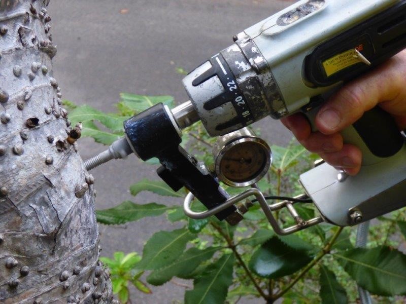 In addition to the 160 plants treated, 25 plants were found to be infected with Jamella, including three in very poor condition; a further three dead plants were found. Treatment was with 50% Confidor, and involved injecting trunks and low braches, or in the case of smaller plants, spraying leaves and squirting the crowns. Size of tree and type of branching determined the number of injections per tree: trees head high received one injection; taller, single trunk trees received two injections; trees branching up high received three injections; and large trees branching received two injections per branch where branches could be reached. Infected trees were marked with blue paint.